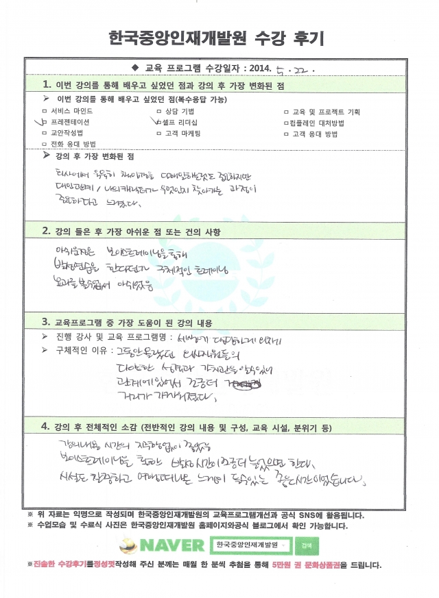 기업연수생들이 정성스럽게 손으로 작성한 진솔한 후기입니다.