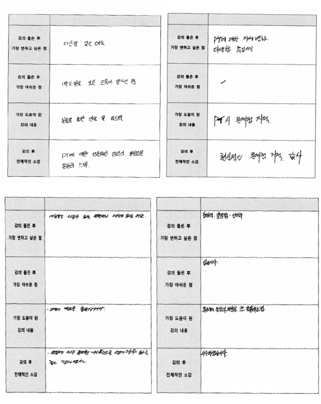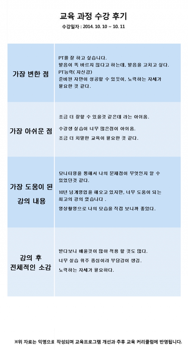 대우루컴즈 영업마케팅 팀장 기업체출강 교육후기 2014년 10월 10일~11일 한국중앙인재개발원에서 이루어진 대우루컴즈 영업마케팅 팀장 기업체출강 교육후기입니다. 강의 후 가장 변화된 점 강의 들은 후 가장 아쉬운 점 또는 건의 사항 교육프로그램 중 가장 도움이 된 강의 내용 강의 후 전체적인 소감 (전반적인 강의 내용 및 구성, 교육 시설, 분위기 등)