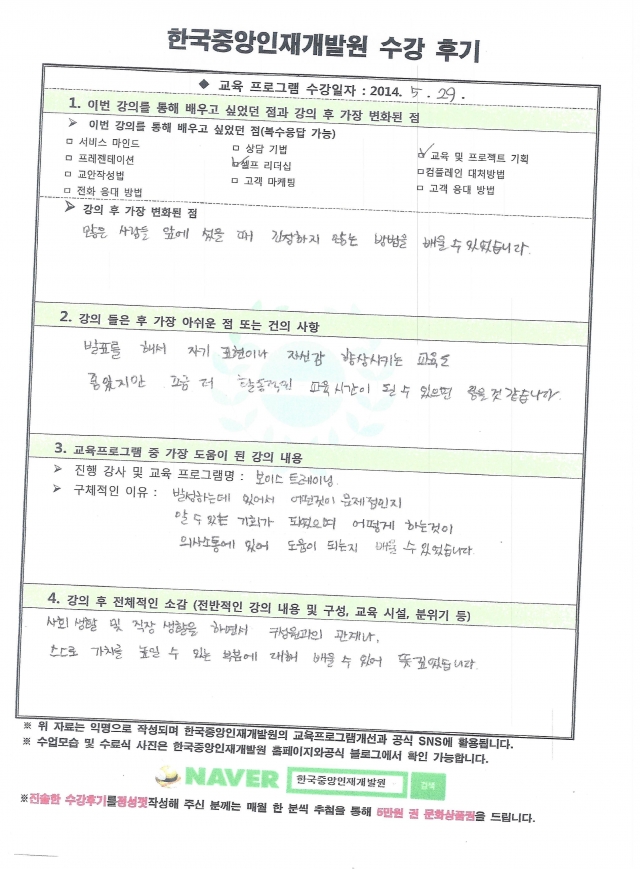-발표를 해서 자기 표현이나 자신감 향상시키는 교육도 좋았지만 조금 더 활동적인 교육시간이 될 수 잇으면 좋을 것 같습니다.